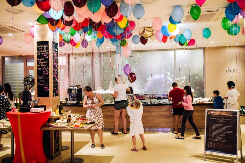 Währenddessen können die Eltern die verschiedenen Whirlpools in den Entspannungszonen genießen und einen angenehmen Abend bei Musikquiz, Beer Pong oder DJ-Musik mit verschiedenen Thematiken verbringen.